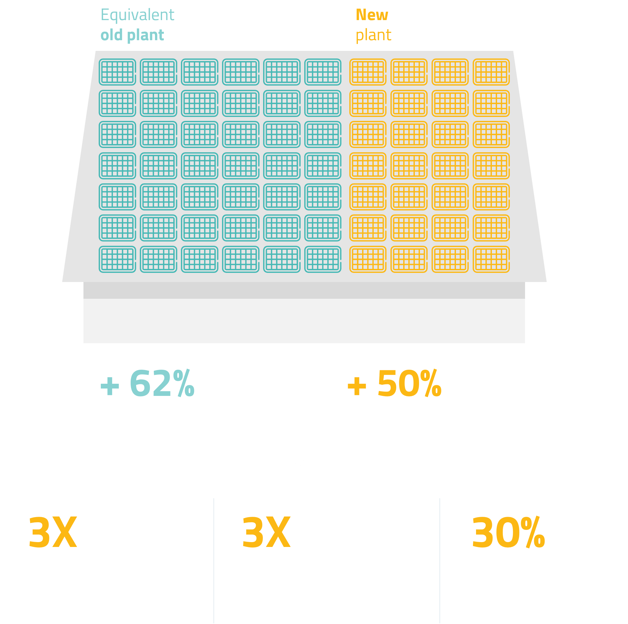 For a 12-year-old installation, we provide our clients with a minimum increase of 62% in production per square meter.