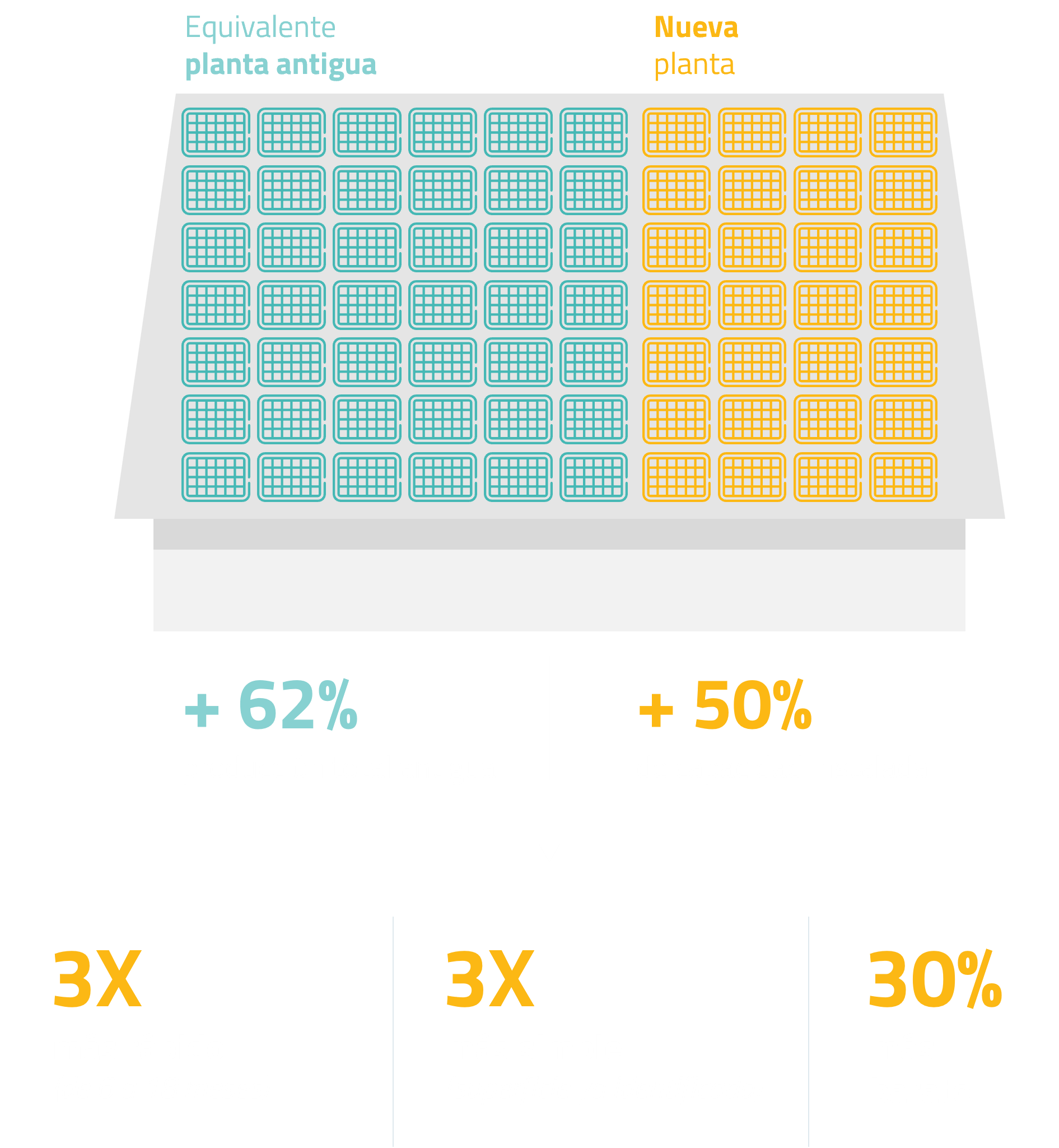 Para una instalación de 12 años, ofrecemos a nuestros clientes un aumento mínimo del 62% en la producción por metro cuadrado.