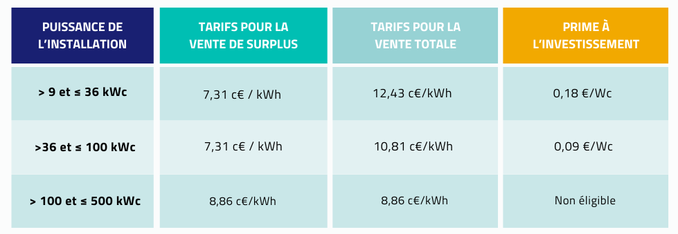Si l’exploitant dispose d’une centrale jusqu’à 100 kWc, ce dernier peut bénéficier d’une prime à l’investissement dont le montant dépend de la puissance installée. Les installations de plus de 100 kWc ne sont pas éligibles.