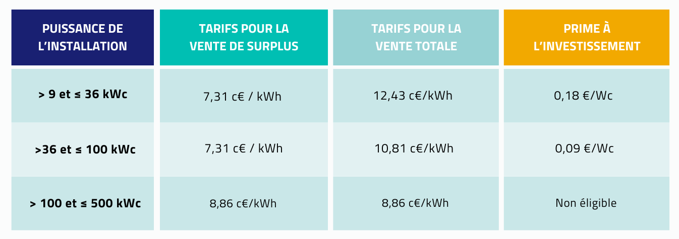 Pour les installations jusqu’à 100 kWc, il est possible de prétendre à la prime à l’investissement pour l’autoconsommation. Son montant dépend de la puissance de l’installation photovoltaïque. Autre mécanisme existant, le “guichet ouvert”, à savoir la vente du surplus ou de la totalité de la production d’électricité à EDF ou aux Entreprises Locales de Distribution (ELD), qui sont soumises à des Obligations d’Achat (OA), à un tarif fixe pendant 20 ans. Sont concernées les installations jusqu’à 500 kWc.